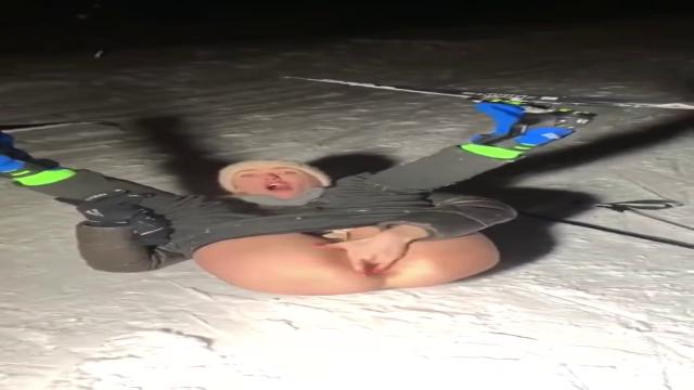 Баба улеглась на снег и занялась дрочкой прямо на лыжах
