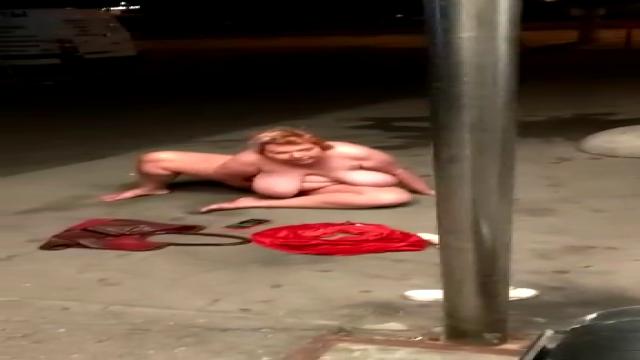 Пьяная голая толстуха мастурбирует на асфальте